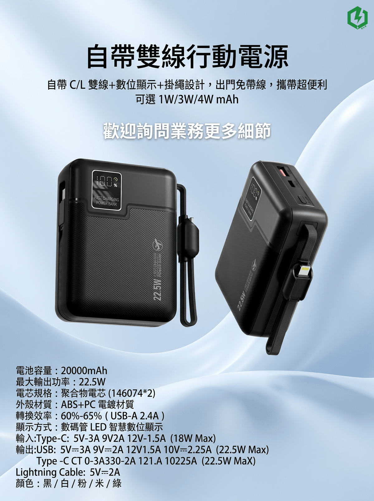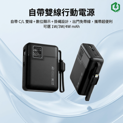 產品介紹:自帶 C/L 雙線+數位顯示+掛繩設計,出門免帶線,攜帶超便利 可選 1W/3W/4W mAh